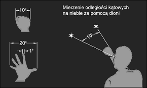 Jak mierzyć te kąty? W astronomii i astronawigacji na przestrzeni wieków używano różnych narzędzi od prymitywnego kwadrantu dawniej, który i dzisiaj bez nakładu większych środków każdy może wykonać w domu, po zaawansowany sekstant, z powodzeniem wciąż używany i dostępny współcześnie. Nam jednak wystarczy nasza własna dłoń wyciągnięta na odległość ręki, ewentualnie linijka. Nie będzie to oczywiście pomiar dokładny lecz na nasze potrzeby wystarczający. Okazuje się, że wyciągnięta na odległość całej ręki dłoń i jej części mierzą określone kąty wobec oczu obserwatora, i to względnie jednakowe u wszystkich ludzi, ze względu na zachowane proporcje budowy ciał. Tak oto złożona w pięść od kciuka do przeciwległego krańca mierzy 10°, rozczapierzona od czubka małego palca po czubek kciuka - 20°, szerokość palca to około 1°, długość płytki paznokcia u kciuka - 2°.